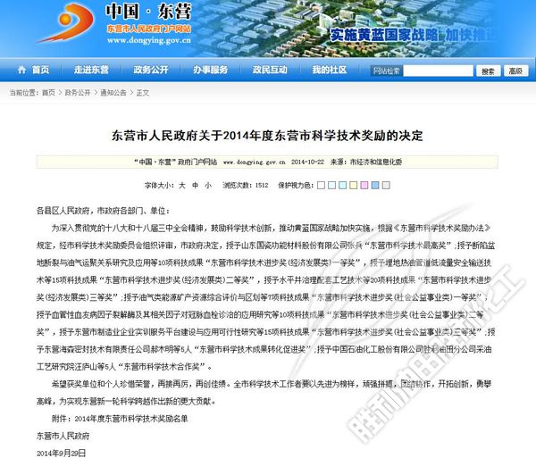 《東營市(shi)人民政府關于(yú)2014年度東營市科(kē)學技術獎勵的(de)決定》