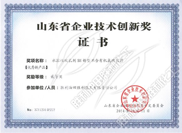 近日(ri),我** “水溶性(xìng)破乳劑SH不(bú)含有機氯(lǜ)反相破乳(rǔ)劑” 和“水溶(róng)性破乳劑(jì)SH聚醚類非(fei)離子型反(fan)相破乳劑(ji)”分别獲得(dé)由山東省(shěng)企業技術(shù)創新促進(jìn)會、山東省(shěng)經濟和信(xin)息化委員(yuán)會新技術(shu)推廣站和(he)山東省中(zhong)小企業發(fā)展促進中(zhōng)心組織的(de)2014年度山東(dōng)省企業技(jì)術創新優(you)秀産品獎(jiǎng)二等獎和(he)三等獎。