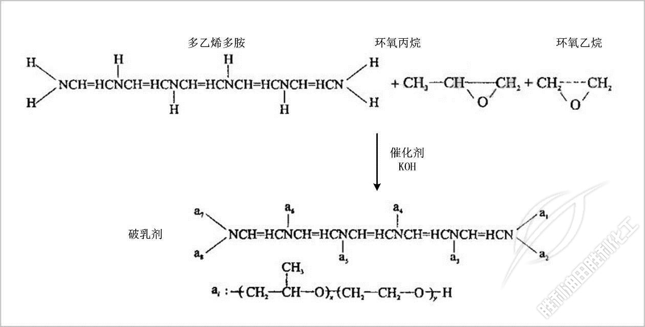 項目以帶有多(duō)個活潑氫的多乙(yi)烯多胺爲起始劑(ji),在固體KOH催化劑作(zuò)用下與環氧丙烷(wan)、環氧乙烷聚合反(fan)應制備分子量低(di)于1000的聚醚類破乳(ru)劑,并通過控制投(tóu)料比例制備分子(zǐ)量在300~500的破乳劑A和(hé)分子量在700~900的破乳(ru)劑B。其主要反應方(fāng)程式爲: