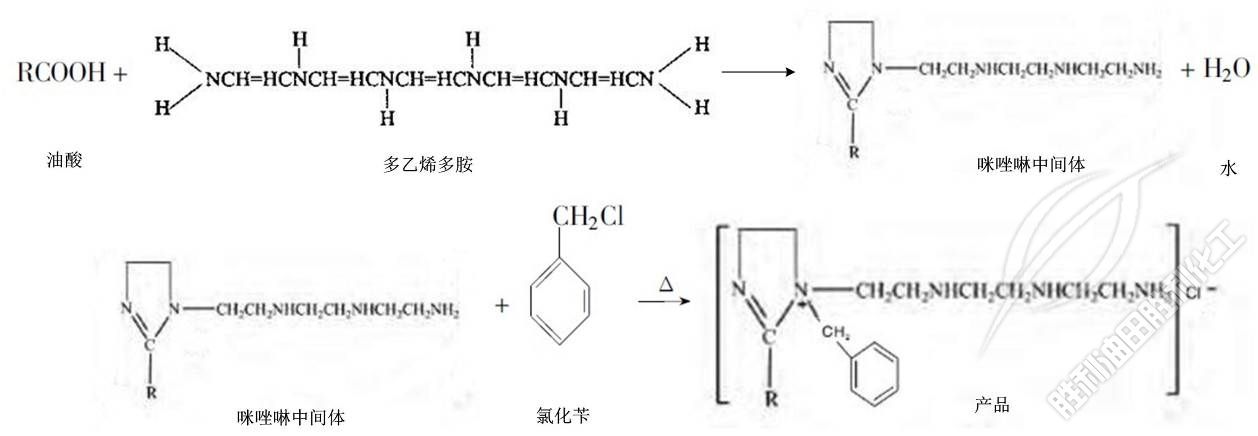 采用真(zhen)空法,以脂肪酸(油(yóu)酸、蓖麻油、精油酸(suān)等)與有機胺類(多(duo)乙烯多胺、二乙烯(xi)三胺、雜環胺等)酰(xiān)胺反應合成咪唑(zuò)啉中間體,再與氯(lü)化苄季铵化反應(ying)合成咪唑啉型緩(huǎn)蝕劑。