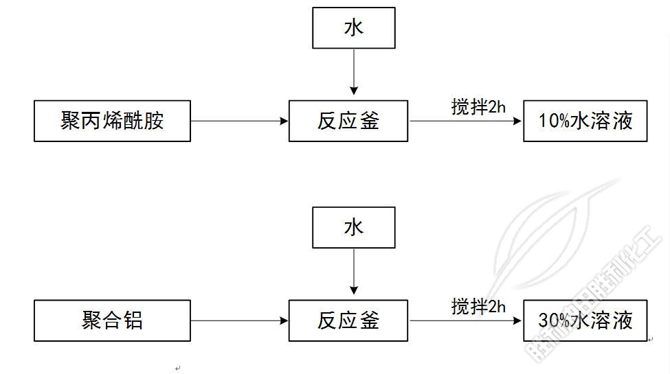 該産品工藝比(bǐ)較簡單,主要爲複(fú)配,将外購的聚丙(bǐng)烯酰胺配制成一(yi)定濃度水溶液,将(jiāng)聚合鋁配制成一(yī)定濃度水溶液。